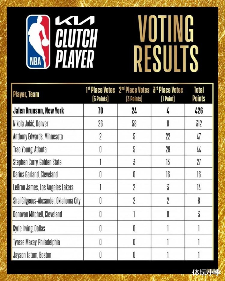 在这当中,布伦森击败了约基奇和爱德华兹,他获得了70张第一选票,24张第二选票,4张第三选票,总得分426分。而在投票当中,詹姆斯也获得了1张第一选票,也是得到了认可,库里也有1张第一选票,无缘季后赛的特雷杨得到5张第二选票,29张第三选票。